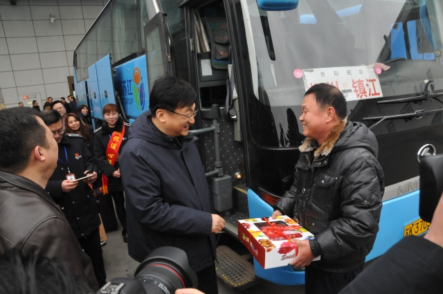 在發車區,丁市長來到揚州至鎮江的班車旁,給駕駛員師傅送上了象征平安吉祥的大蘋果,并叮囑駕駛員師傅,一定要注意安全,要將旅客平安送到他們的親人身邊。